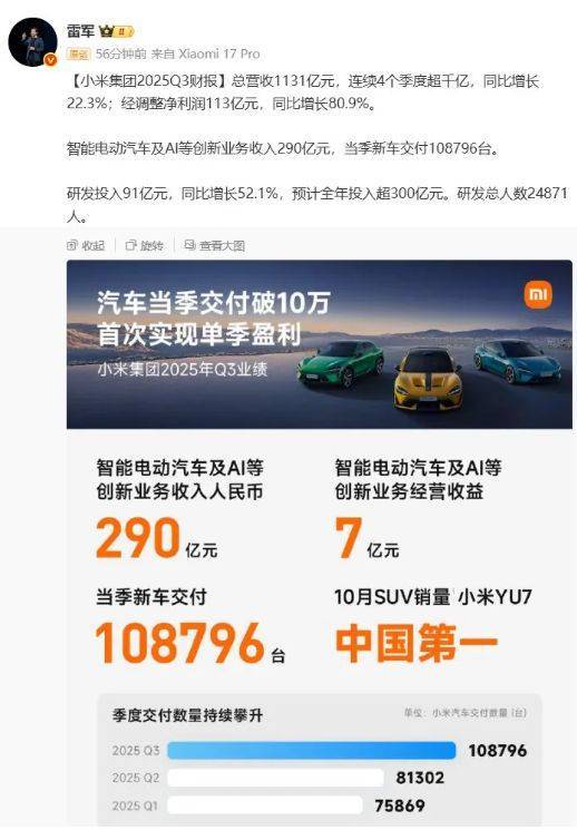 財務表現同樣亮眼。最新財報顯示,小米集團第三季度營收達1131.21億元,連續四個季度突破千億大關;經調整凈利潤113億元,同比增長80.9%。智能電動汽車及AI創新業務分部收入290億元,同比增長199%,其中汽車業務貢獻283億元。值得關注的是,該業務板塊首次實現單季度經營利潤轉正,盈利7億元。