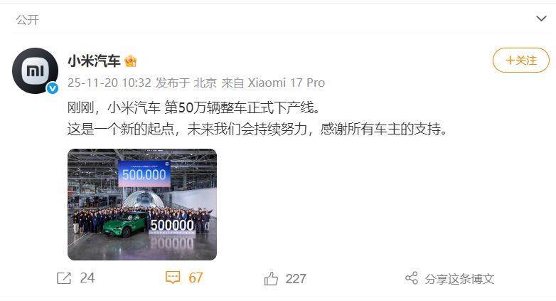 行業分析師指出,小米汽車用不到兩年時間完成從0到50萬輛的跨越,不僅驗證了其"生態造車"模式的可行性,也為傳統車企轉型提供了新范本。隨著產能爬坡與渠道完善,其市場滲透率有望進一步提升。