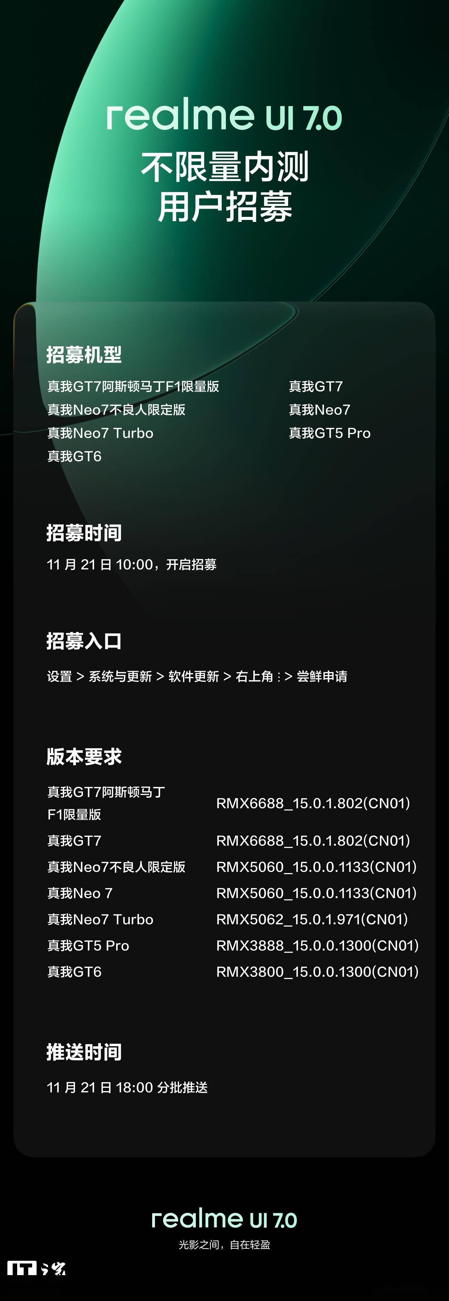參與此次內測的機型陣容強大,包括真我GT7阿斯頓馬丁F1限量版、真我GT7、真我Neo7不良人限定版、真我Neo7、真我Neo7 Turbo、真我GT5 Pro以及真我GT6。用戶可通過手機設置中的"系統與更新"路徑,進入"軟件更新"界面,點擊右上角菜單選擇"嘗鮮申請"即可參與。內測版本將于11月21日18時起分批次推送,確保系統穩定性。