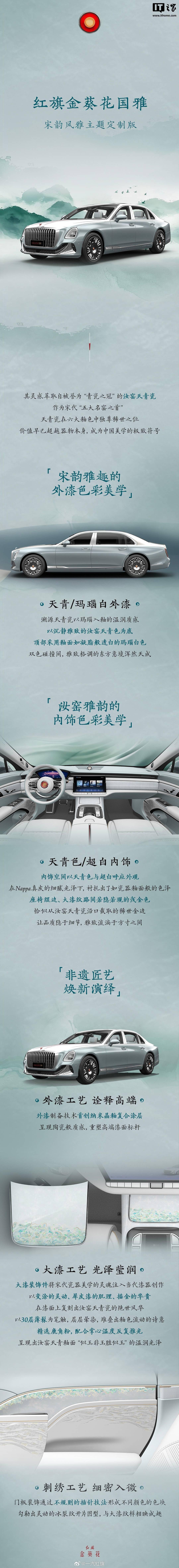 在外觀方面,定制版車型采用天青與瑪瑙白雙色外漆,其制備技術首創納米晶釉復合涂層工藝,使車身呈現出類似陶瓷的溫潤質感。內飾則以天青色與超白為主色調,搭配大漆裝飾件與刺繡工藝門板,營造出典雅奢華的座艙氛圍。這些設計細節不僅體現了對宋代美學的致敬,更展現了紅旗品牌在工藝創新上的突破。