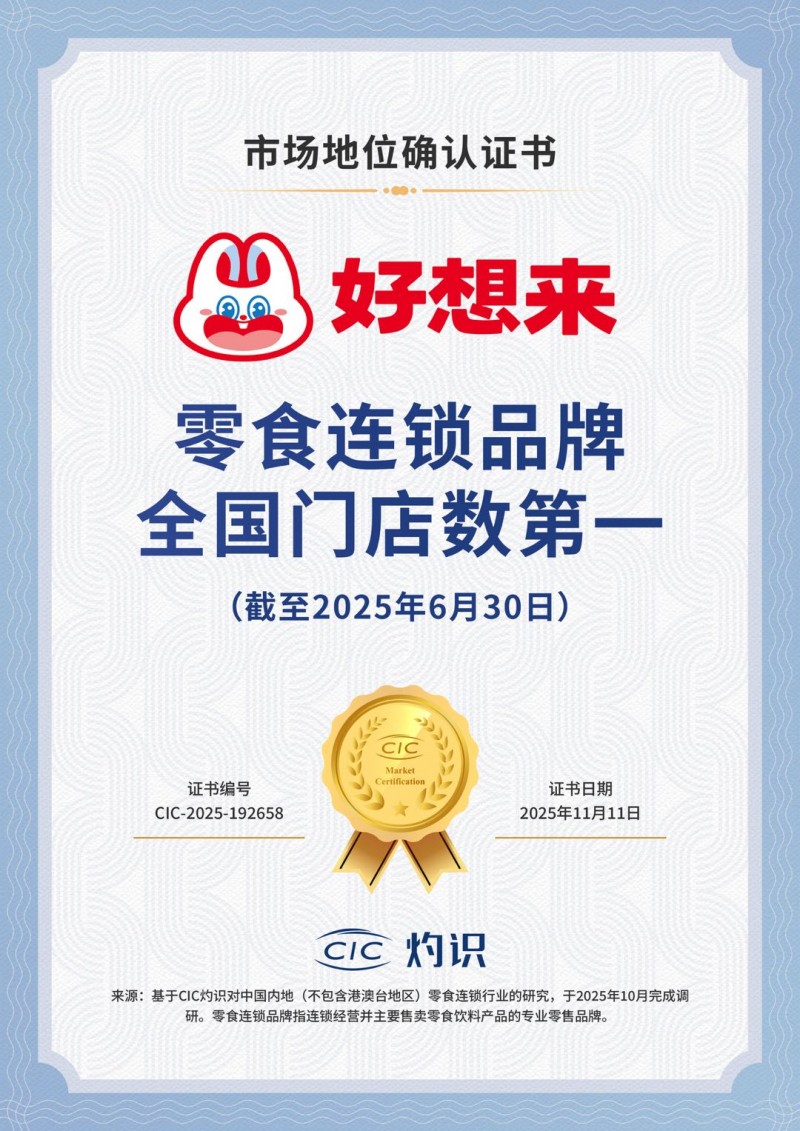 近日,專業咨詢公司CIC灼識咨詢頒發市場地位確認證書,稱經對中國內地(不包含港澳臺地區)零食連鎖行業的研究,截至2025年6月30日,萬辰集團旗下量販零食品牌好想來全國門店數量位列零食連鎖品牌第一。