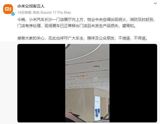 小米汽車長沙某門店近日遭遇突發狀況。據小米公司官方發布的信息顯示,當晚該門店展廳內物業的中央空調設備突發明火,火情發生后,門店工作人員迅速啟動應急預案,同時第一時間聯系消防部門。