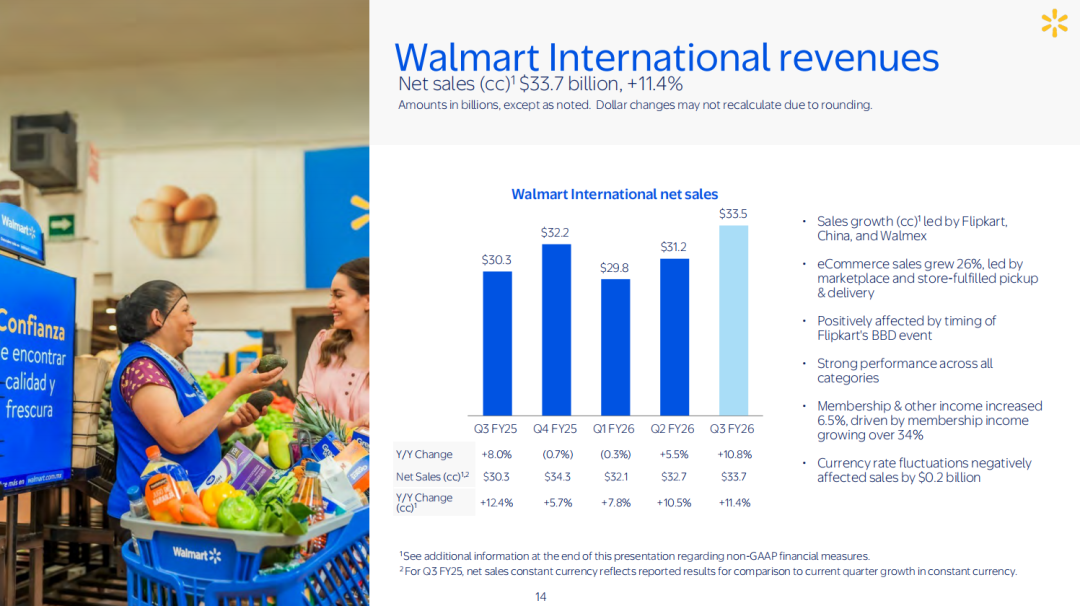 沃爾瑪最新發布的2026財年第三季度財報顯示,截至2025年10月31日的三個月內,公司全球營收達1795億美元,同比增長5.8%,按固定匯率計算增幅為6.0%。盡管營業利潤因印度數字支付公司PhonePe為潛在IPO支付非現金股權激勵費用而下降0.2%,但經調整后營業利潤仍實現8.0%的增長,調整后每股收益為0.62美元。全球電商業務表現尤為突出,銷售額同比增長27%,成為拉動整體增長的重要引擎。