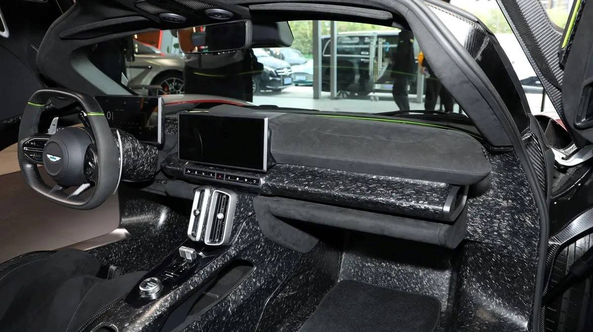 走進車內,阿斯頓·馬丁Valhalla營造出一種獨特的氛圍,既保留了濃郁的賽車風格,又融入了當下流行的科技元素。車內配備了大尺寸的數字儀表盤和信息娛樂屏,不僅內置了實用的導航系統,還支持Apple CarPlay手機互聯功能,為駕駛者帶來便捷的智能體驗。平底碳纖維方向盤和一體式碳纖維座椅的配備,進一步強化了車內的賽車氛圍,讓駕駛者仿佛置身于專業賽道之上。