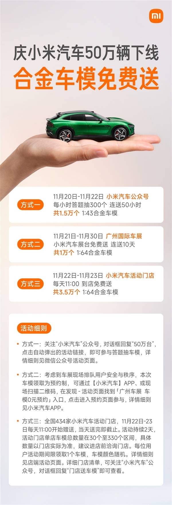 具體領取方式分為三類:其一,通過"小米汽車"官方微信公眾號參與答題互動抽獎,每小時放出300個名額,持續50小時,總計1.5萬個;其二,2025廣州車展期間,每日在小米汽車展臺現場發放1000個,連續10天共計1萬個;其三,全國小米汽車活動門店將開放3.5萬個車模的免費領取通道。