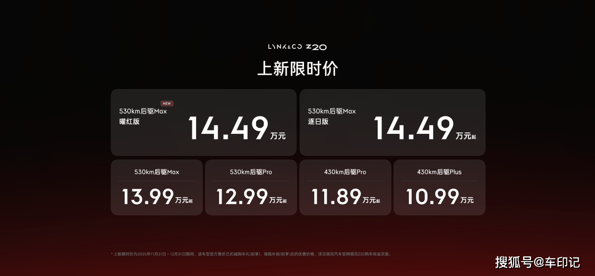 在廣州車展的聚光燈下,一款名為“智趣駕享純電SUV”的領克Z20 530km后驅Max曜紅版正式亮相,以14.49萬元的上新限時價,為A級純電SUV市場注入了一股新鮮活力。這款車不僅以獨特的“曜紅”內飾吸引眼球,更在多個維度展現了其全能實力,成為都市精致出行的新選擇。