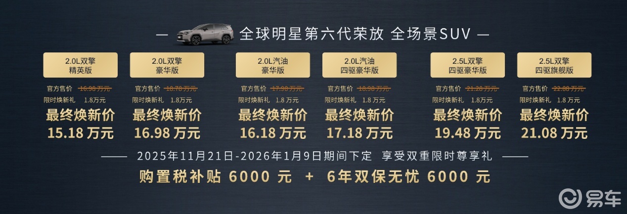 一汽豐田此次在價格策略上誠意滿滿。官方宣稱,全新榮放在外觀設計、智能座艙、動力總成、智駕輔助以及安全配置等多個方面進行了全面升級,整體升級幅度折算約1.5萬元。然而,部分車型的定價卻不升反降。以全新榮放2.0L雙擎豪華版為例,相較于上一代風尚PLUS 2.0汽油版(售價19.98萬元),其產品力顯著提升,但官方指導價僅為18.78萬元,賬面綜合價值提升接近2.7萬元。若在“限時尊享下定期”期間,還可享受最高1.8萬元現金權益,實際到手價最低可至16.98萬元。后續還能再享6000元購置稅補貼以及價值6000元的售后服務禮包,進一步降低了混動SUV的準入門檻。
