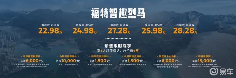 在本屆廣州車展上,全球首款“全地形露營SUV”——福特智趣烈馬得到了眾多媒體和觀眾的關注。該車型增程版提供遠灣、墨鉆、長灘三款配置,預售價分別為22.98萬元、24.98萬元與27.28萬元,CLTC綜合續航里程達1220公里;純電版包含墨鉆與長灘兩款配置,預售價分別為25.98萬元與28.28萬元,續航里程達650公里。預售期間,用戶可尊享總價值高達4萬元的6大預售權益。