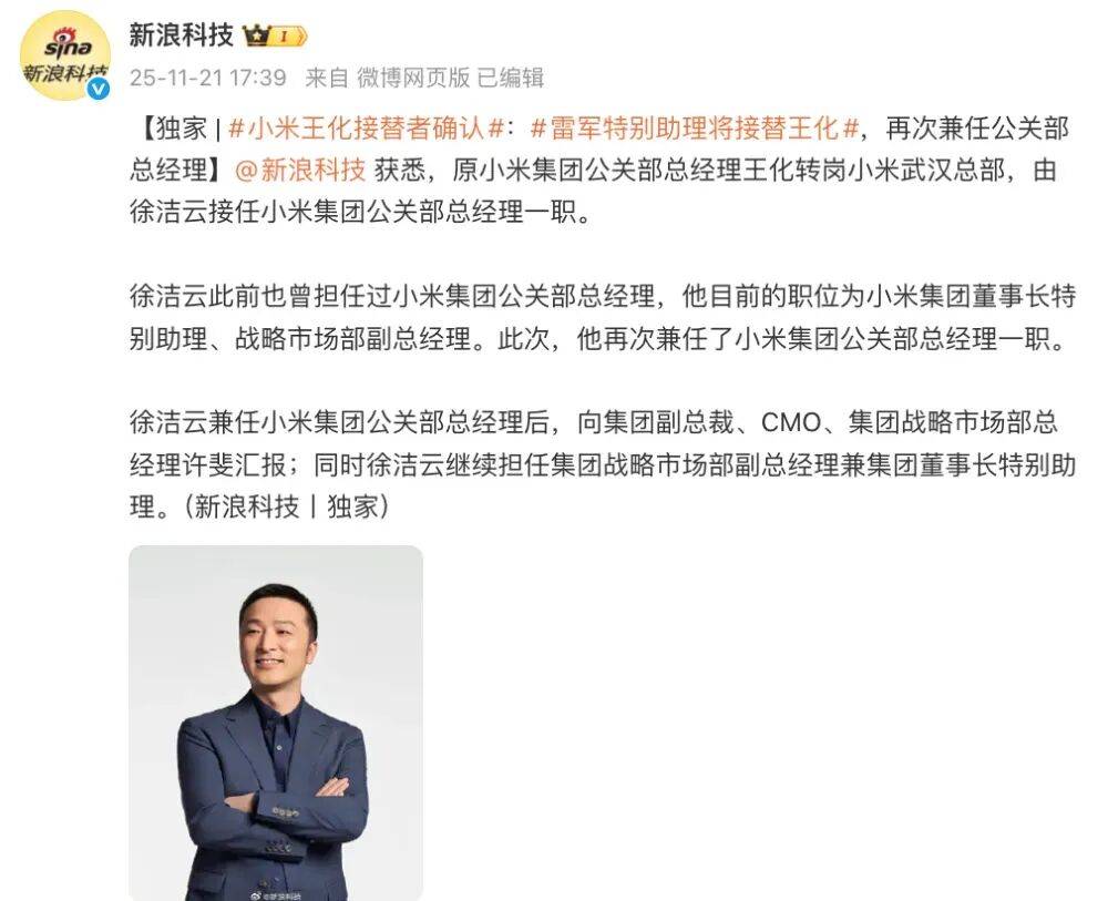 小米集團近日完成了一次重要的人事調整。原公關部總經理王化已正式轉崗至小米武漢總部,其職位由徐潔云接任。這一變動引發了外界的廣泛關注,王化本人也在社交平臺公開回應了相關傳聞。