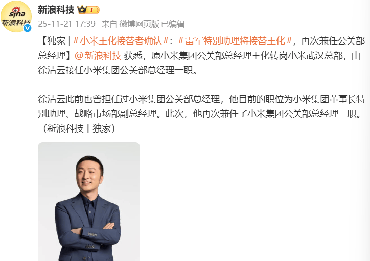 小米公關部換帥!王化轉崗武漢總部,稱系正常輪崗非“背鍋”