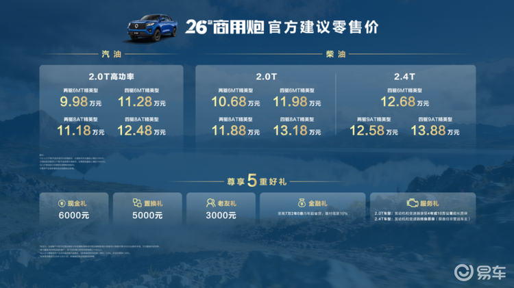 價格方面,各系列車型定位清晰。商用炮官方建議零售價在9.98萬元至14.28萬元之間,乘用炮為12.68萬元至16.88萬元,越野炮則是17.98萬元至18.88萬元。為助力消費者購車,廠家誠意滿滿地推出多項購車禮遇。商用炮用戶可享受6000元現金優惠、5000元置換補貼、3000元老友補貼,還有金融、服務相關權益;乘用炮在此基礎上增加互聯相關權益,共六項;越野炮用戶能獲得10000元現金優惠、10000元置換補貼、5000元老友補貼,以及金融、服務、互聯六項權益。