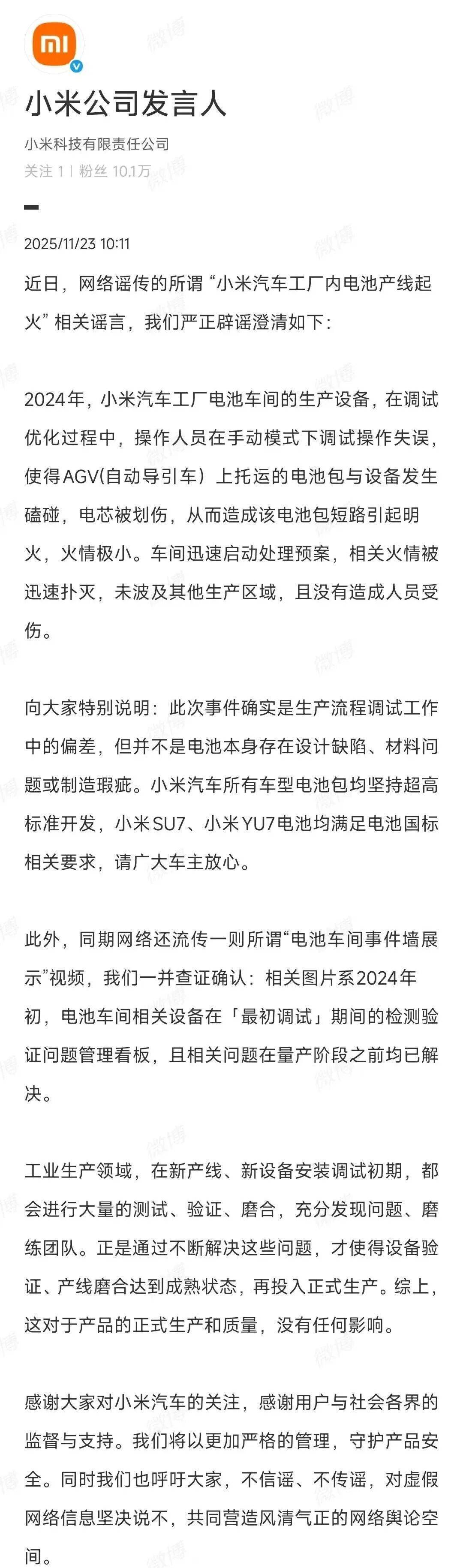 針對(duì)網(wǎng)絡(luò)流傳的“小米汽車(chē)工廠電池產(chǎn)線起火”相關(guān)不實(shí)信息,“小米公司發(fā)言人”通過(guò)官方微博發(fā)布聲明予以澄清。據(jù)介紹,此次事件發(fā)生于小米汽車(chē)工廠電池車(chē)間設(shè)備調(diào)試階段,系操作人員手動(dòng)調(diào)試過(guò)程中出現(xiàn)失誤,導(dǎo)致自動(dòng)導(dǎo)引車(chē)(AGV)運(yùn)輸?shù)碾姵匕c設(shè)備發(fā)生磕碰,電芯表面劃傷引發(fā)局部短路并產(chǎn)生明火。火勢(shì)在第一時(shí)間得到控制,未蔓延至其他生產(chǎn)區(qū)域,也未造成人員傷亡。