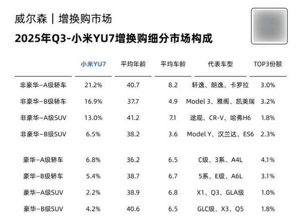在用戶畫像方面,SU7與YU7的增換購群體呈現出明顯差異。SU7的增換購車主多為40歲以上、舊車使用超過8年的“被動升級群體”,他們對車輛的續航能力和后期維護成本較為關注。相比之下,YU7的增換購用戶更為年輕,B級轎車和SUV用戶的平均年齡分別為37.7歲和38.2歲,舊車車齡僅4.9年和3.6年,屬于“主動升級群體”。這部分用戶更愿意嘗試先進的智能配置,如激光雷達和P-HUD等。