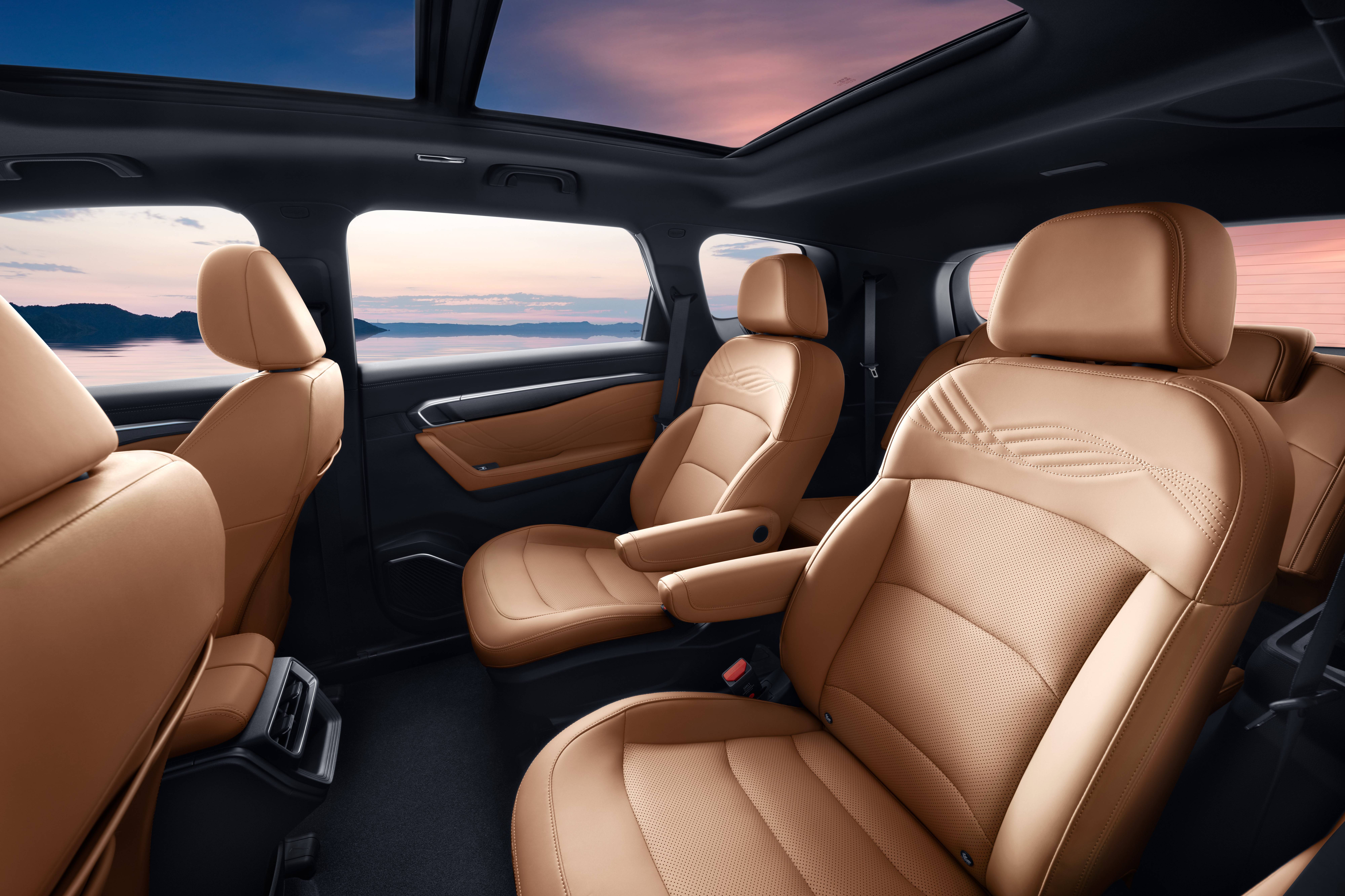 在空間布局上,新款豪越L提供了5座、6座、7座三種座椅布局方式。其中,5座版本車型憑借1910mm的車寬,不僅擁有628L的超大行李箱空間,還巧妙設計了96L的隱藏式暗格以及46L的隨車工具專屬空間。6座版本則采用了2+2+2的座椅布局,中央通道寬度達到了179mm,第二排座椅不僅美觀且舒適,配備了四向電動調節、8點氣動按摩以及3檔通風與加熱等舒享功能。7座版本則采用了2+3+2的全獨立座椅布局,第三排乘坐空間寬敞,靠背可實現8檔16°調節,同時全車還擁有49處儲物空間以及32種空間組合方式,二、三排全平放倒后可拓展為2360升儲物空間或2.2米大床模式,滿足露營、長途等多種出行場景的需求。