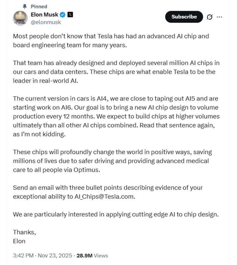 特斯拉在芯片研發(fā)領(lǐng)域又有新動作。近日,特斯拉首席執(zhí)行官埃隆·馬斯克通過社交平臺X透露,公司正在推進兩款重要芯片的研發(fā)進程。其中,特斯拉AI5芯片的設(shè)計工作已進入尾聲,與此同時,新一代AI6芯片的研發(fā)也已正式啟動。這兩款芯片不僅將應(yīng)用于特斯拉旗下的汽車產(chǎn)品,還計劃在數(shù)據(jù)中心領(lǐng)域發(fā)揮作用。
