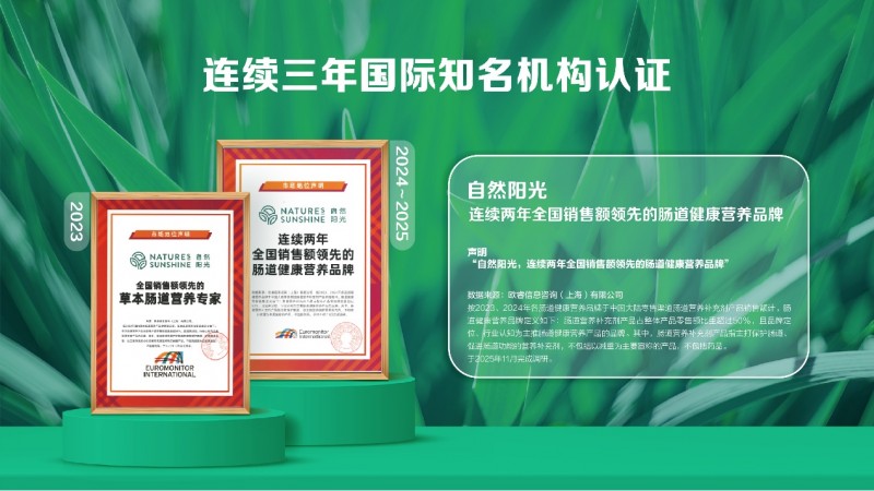 憑借出色的產品品質,自然陽光成為“全國銷售額領先的腸道健康營養品牌”,成功實現了品牌價值的拓展,彰顯了在腸道健康領域的實力。