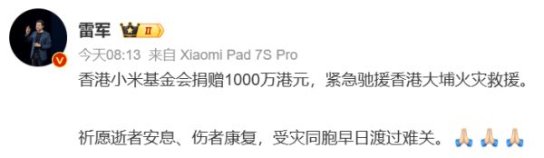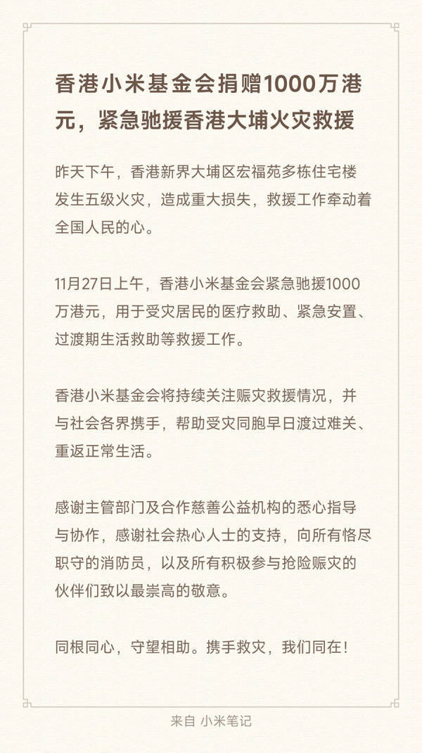 為助力受災(zāi)同胞渡過難關(guān),香港小米基金會于今日上午宣布,緊急捐贈1000萬港元用于賑災(zāi)救援。這筆資金將專項用于受災(zāi)居民的醫(yī)療救助、緊急安置及過渡期生活保障,確保受災(zāi)群眾的基本生活需求得到及時滿足。