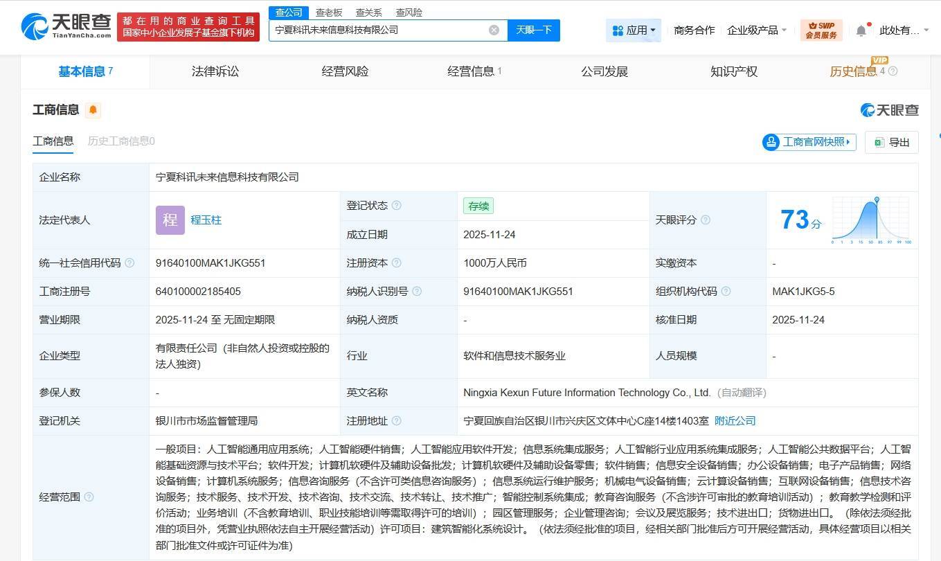 據企業信息查詢平臺天眼查披露,一家名為寧夏科訊未來信息科技有限公司的新企業完成工商注冊登記。該企業法定代表人為程玉柱,注冊資本達1000萬元人民幣,由科大訊飛(證券代碼002230)全資控股。