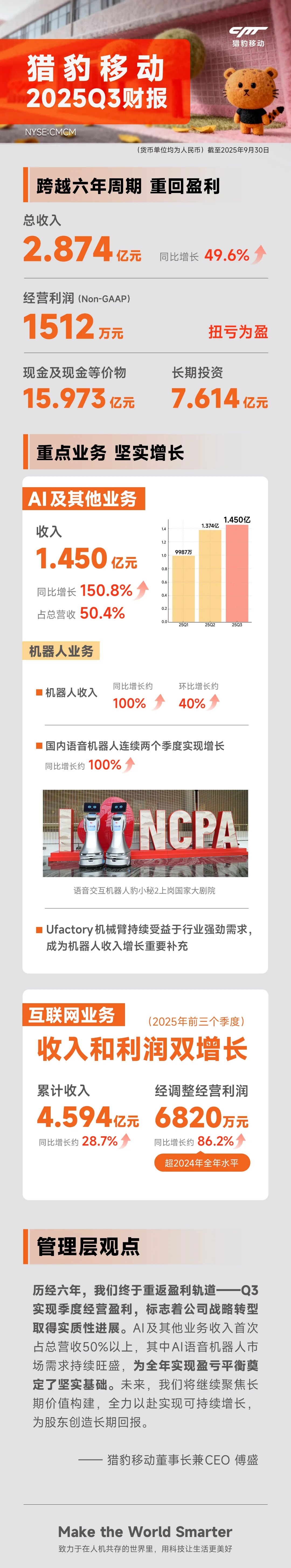 公司管理層在財報中強調,經過六年戰略調整,獵豹移動已重回盈利軌道。董事長傅盛指出,AI語音機器人市場需求持續釋放,不僅推動業務占比突破五成,更為全年經營目標達成奠定基礎。當前公司正加速構建"AI+硬件+服務"的生態體系,通過垂直場景的深度滲透,持續鞏固在智能服務機器人領域的領先地位。