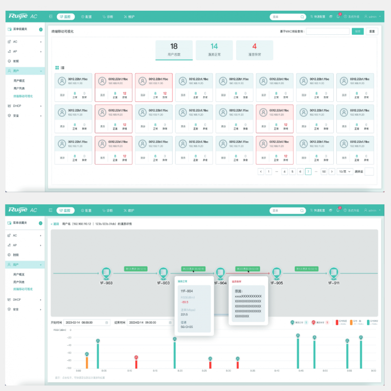 網絡的持續“保鮮”,離不開智能高效的運維系統。惠誠食品部署的UNC AS 運維管理平臺支持光網絡的可視化智能管理,運維人員可以對全網的光鏈路及有線設備進行統一監控。同時,方案還支持在AC Web對終端漫游軌跡回放和天饋線狀態實時監測,簡化故障排查流程。運維效率的提升,可以讓兩位運維人員有更多精力投入到新園區的網絡規劃與建設中。