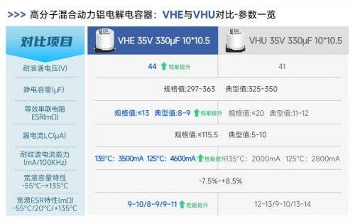 在核心性能指標方面,VHE系列展現多維優勢:其ESR值穩定在9-11mΩ區間,較前代產品波動范圍縮小30%,高溫損耗降低45%;紋波電流處理能力提升1.8倍,可高效濾除電機驅動產生的高強度紋波,減少電壓波動對周邊敏感器件的干擾;耐浪涌電壓從41V提升至44V,漏電流典型值控制在5-10μA,寬溫容量變化率僅-7.5%至+8.5%,性能穩定性遠超國際同類產品。