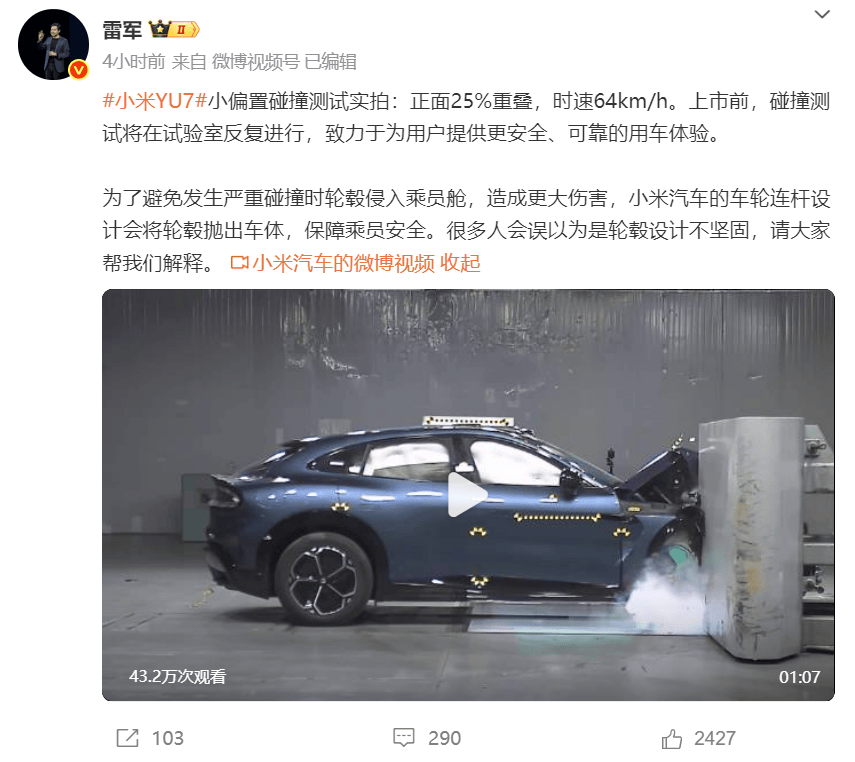 針對近期網絡流傳的安全質疑,雷軍同步展開技術解密。他公布了小米YU7的小偏置碰撞測試細節:在正面25%重疊、64km/h時速的嚴苛條件下,車輛通過特殊設計的車輪連桿結構,使輪轂在碰撞時脫離車體,避免侵入乘員艙。這項被誤解為"輪轂不堅固"的設計,實則是為提升碰撞安全性的創新方案。此前雷軍曾多次展示SU7的研發標準,包括51,000Nm/deg的整車扭轉剛度及全球三大安全認證。
