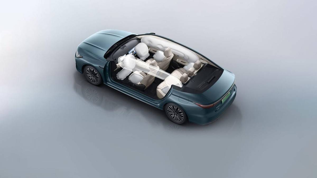 車內被動安全配置同樣堪稱“豪華”。全系標配10安全氣囊,包括同級罕見的膝部氣囊與第二排側氣囊,近2米長的側氣簾可在碰撞后6秒內保持80%以上壓力,為前后排乘客提供全方位緩沖保護。這種“不計成本”的安全投入,在中級混動轎車中實屬罕見。