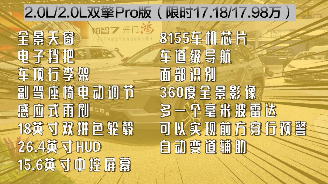 在AIR版的基礎(chǔ)上,消費(fèi)者可選擇加價(jià)升級(jí)至PRO版。燃油版加價(jià)1.2萬(wàn)元,雙擎版加價(jià)1萬(wàn)元,即可享受全景天窗、電子擋把、車頂行李架、副駕駛電動(dòng)調(diào)節(jié)、感應(yīng)式雨刷、雙拼色輪轂、26.4英寸HUD抬頭顯示系統(tǒng)、15.6英寸中控屏幕(搭載8155車機(jī)芯片)、360度全景影像以及毫米波雷達(dá)等高級(jí)配置。這些升級(jí)功能既實(shí)用又提升駕駛體驗(yàn),加價(jià)幅度合理,值得考慮。