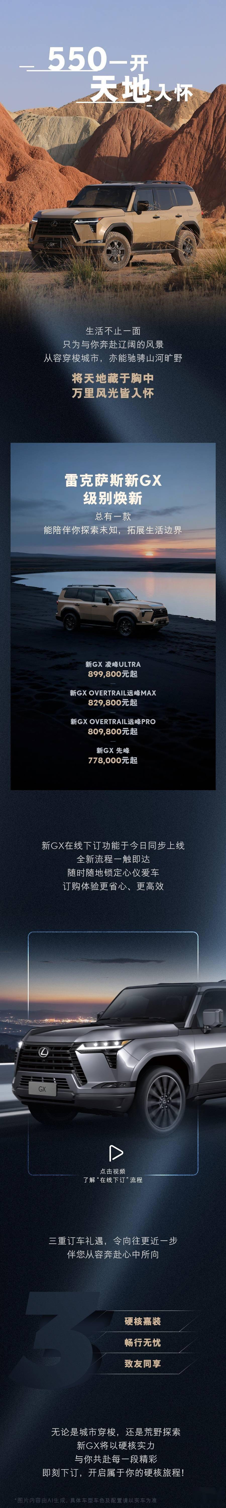 雷克薩斯全新GX車型正式登陸市場,此次共推出四款不同配置版本,官方指導價區間設定在77.8萬元至89.98萬元之間。消費者現已可通過線上渠道完成訂購,開啟個性化購車體驗。