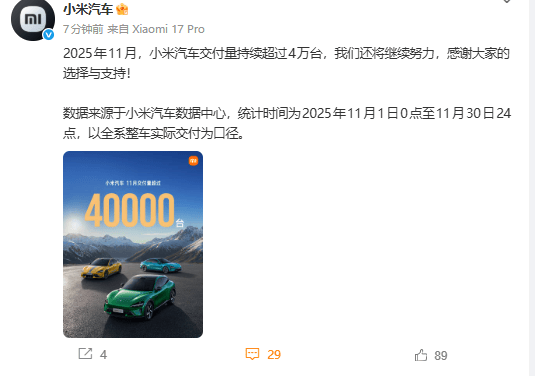 小米汽車近日公布了最新的市場表現及渠道拓展成果。數據顯示,11月交付量突破4萬臺,這一成績引發市場關注。公司創始人雷軍通過社交平臺回應稱,團隊將持續優化產品與服務,并感謝用戶的信任與支持。