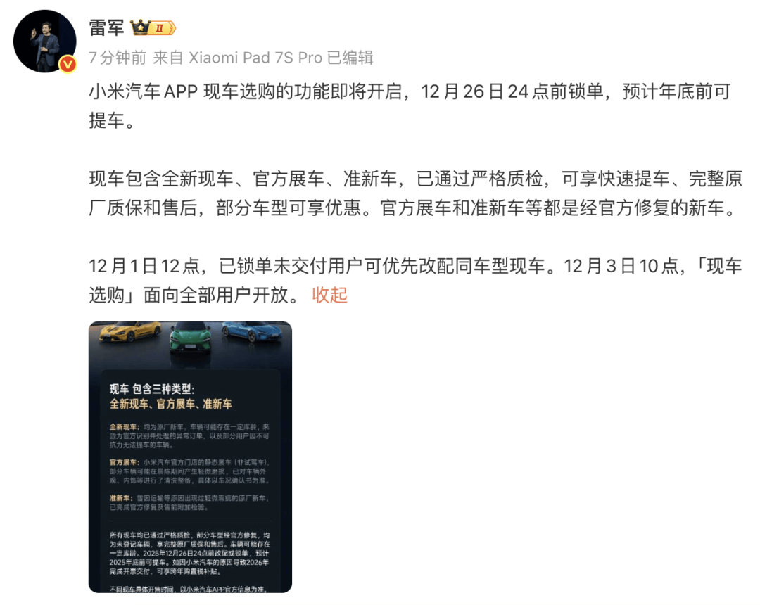 對于其他用戶,現車選購服務將于12月3日10點全面開放。屆時,所有用戶均可通過小米汽車APP瀏覽現車資源,并根據自身需求進行選擇。這一服務的推出,標志著小米汽車在銷售模式上的進一步創新,為用戶提供了更加靈活的購車方案。