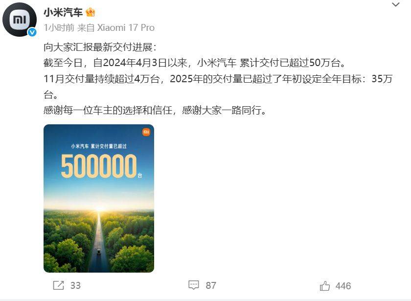 小米汽車近日公布了最新交付數據及銷售新舉措。自2024年4月啟動交付以來,截至12月2日,該品牌累計交付量已突破50萬臺,其中11月單月交付量連續第二個月超過4萬臺。值得關注的是,2025年尚未過半,其全年交付量已超越年初設定的35萬臺目標。