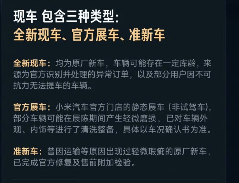 12月1日,小米汽車創始人雷軍通過社交平臺宣布,小米汽車APP將于近期上線現車選購功能。根據規則,用戶在12月26日24點前完成鎖單,可享受年底前提車服務。這一模式涵蓋三類現車資源:全新現車、官方展車及準新車,所有車輛均通過嚴格質檢流程,并提供完整原廠質保及售后服務,部分車型還推出優惠方案。