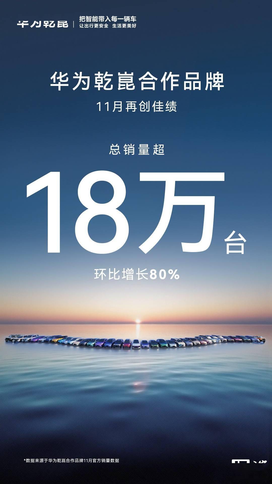 華為乾崑智能汽車解決方案近日公布最新市場(chǎng)數(shù)據(jù),其伙伴品牌在11月實(shí)現(xiàn)總銷量突破18萬臺(tái),環(huán)比增幅達(dá)80%。這一成績(jī)?cè)醋远嗉液献鬈嚻蟮墓俜浇y(tǒng)計(jì),顯示出華為智能汽車生態(tài)的強(qiáng)勁增長(zhǎng)勢(shì)頭。