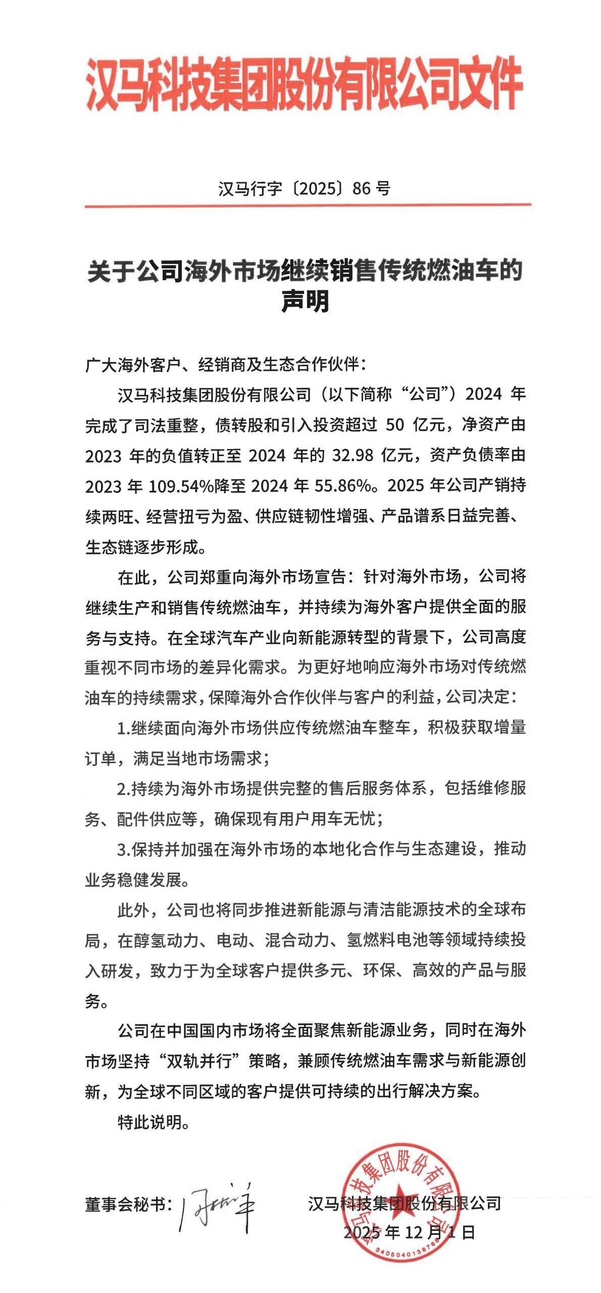 公開信息顯示,漢馬科技此前已明確新能源轉型方向。2022年6月,公司曾發布公告,計劃于2025年12月停止傳統燃油車的整車生產,全面轉向純電動、甲醇動力、混合動力及氫燃料電池等新能源與清潔能源汽車業務。這一戰略調整體現了公司對綠色出行的堅定承諾。