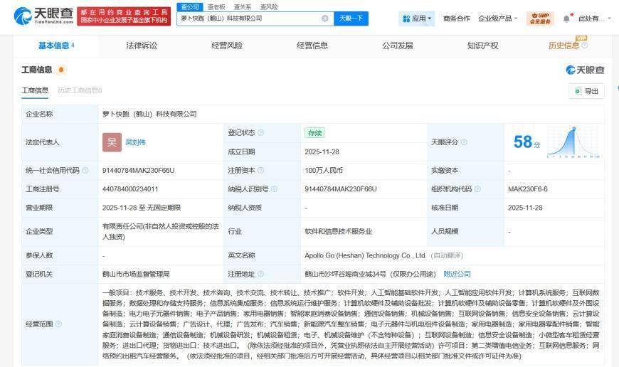 一家名為蘿卜快跑(鶴山)科技有限公司的新企業(yè)近期完成工商注冊登記,正式進(jìn)入市場視野。據(jù)公開信息顯示,該公司法定代表人為吳劉偉,注冊資本設(shè)定為100萬元人民幣,由蘿卜運力(北京)科技有限公司全資控股。