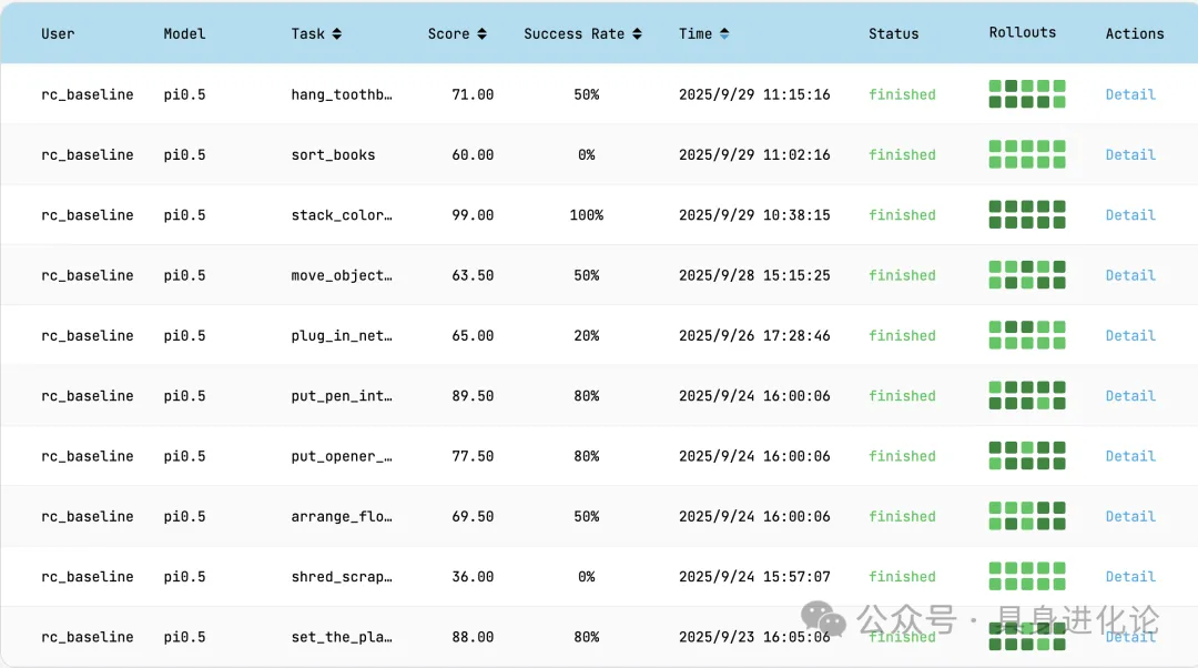 “具身進化論”從進度分情況看到,模型雖然在部分任務中能完成初段動作,但多數情況下未能完成關鍵步驟,執行鏈條往往在中段被迫中斷。這與平臺強調的“多階段連續操作能力”形成明顯差距。