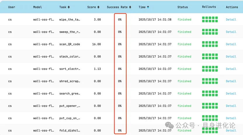 相比之下,自變量的wall-oss-flow 在相同條件下的表現明顯偏弱。測評結果顯示:wall-oss-flow共測試31次,其中2次成功率為60%,1次成功率為50%,1次成功率為20%,其余所有任務成功率均為0。
