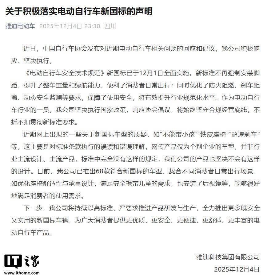 針對近期網絡上關于新國標車型的爭議,如“無法載童”“鐵皮座椅設計”“超速剎車問題”等,雅迪科技明確表示,這些質疑源于對標準條款的誤解。網傳產品僅為個別企業的非主流設計,并非行業普遍現象,新標準中從未作出此類規定。作為行業頭部企業,雅迪科技已推出68款符合新國標的車型,通過優化座椅舒適性、承重能力以及增設后視鏡等配置,充分滿足消費者日常出行需求,包括安全攜帶兒童等場景。