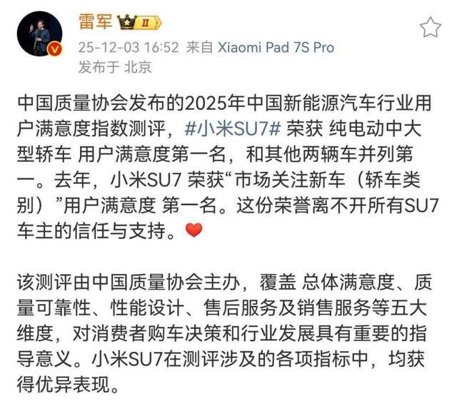 中國(guó)質(zhì)量協(xié)會(huì)最新發(fā)布的2025年新能源汽車行業(yè)用戶滿意度指數(shù)測(cè)評(píng)結(jié)果顯示,小米SU7在純電動(dòng)中大型轎車細(xì)分領(lǐng)域斬獲用戶滿意度榜首,與另外兩款車型并列第一。這是該車型繼去年獲得"市場(chǎng)關(guān)注新車(轎車類別)"用戶滿意度冠軍后,再次獲得權(quán)威機(jī)構(gòu)認(rèn)可。小米創(chuàng)始人雷軍通過社交平臺(tái)發(fā)布消息稱,這份榮譽(yù)源自廣大車主的信任與支持,并表示將持續(xù)優(yōu)化產(chǎn)品體驗(yàn)。