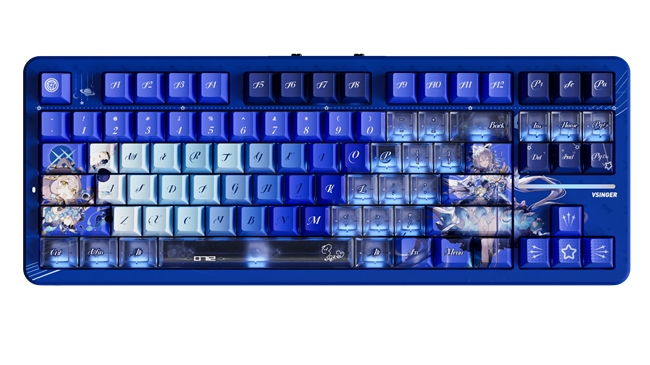 這種設計并非單純的視覺堆砌,而是將IP符號轉化為可感知的使用體驗。PC材質霧透鍵帽不僅提升了光效的通透度,更讓“星河流轉”的視覺效果落到實處:當用戶在深夜辦公或創作時,鍵盤的動態光效如同洛天依的歌聲般溫柔陪伴;而在游戲或打字場景中,光效隨操作節奏變化,形成獨特的“人機共鳴”。正如設計理念中所闡釋的,這不僅是性能標桿,更是科技與藝術融合的誠意之作,讓鍵盤從“輸入工具”升級為“桌面美學藝術品”。