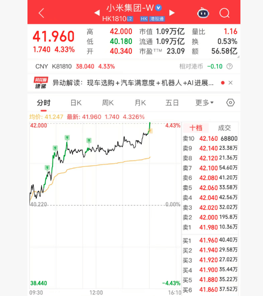 小米集團(tuán)-W在資本市場的表現(xiàn)持續(xù)亮眼。12月4日午后,其股價延續(xù)強(qiáng)勢上漲態(tài)勢,截至15時01分,股價攀升至41.96港元/股,漲幅達(dá)4.33%,當(dāng)日成交額更是突破56億港元,市場活躍度顯著提升。