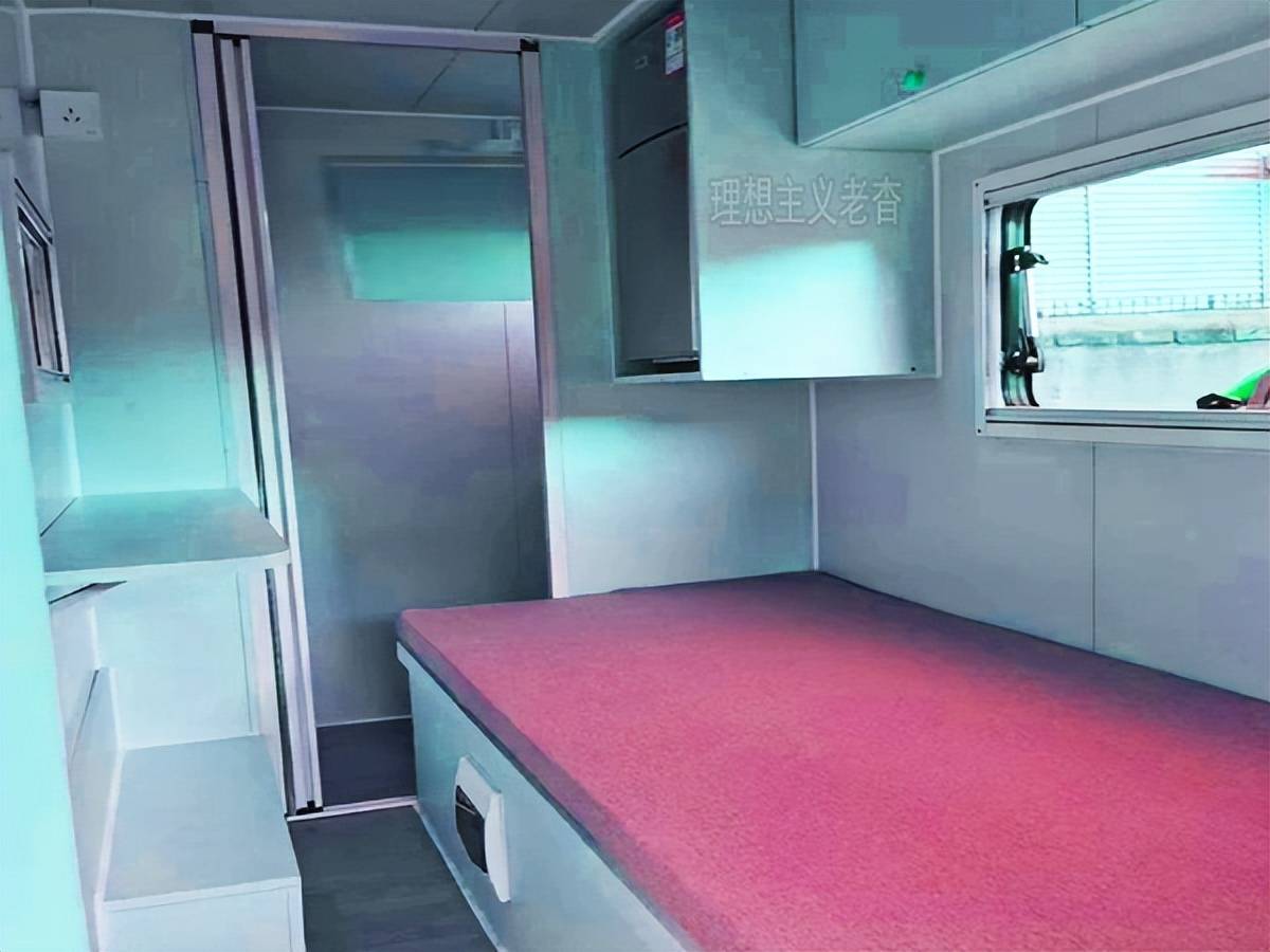 走進房車內部,細節之處盡顯貼心。連床墊都選用了粉紅色,營造出溫馨浪漫的氛圍。在左側上部,配備了車載冰箱和木制吊柜,車載冰箱可以方便地儲存食物和飲料,木制吊柜則增加了收納空間,讓車內物品擺放更加整齊有序。右側下方設有儲物箱,方便存放一些常用物品。中間位置是折疊桌,不用時可以折疊起來,節省空間,使用時展開又能滿足用餐、辦公等多種需求。車尾處是洗手間,解決了人們在房車生活中的如廁和洗浴問題,讓房車生活更加便捷舒適。