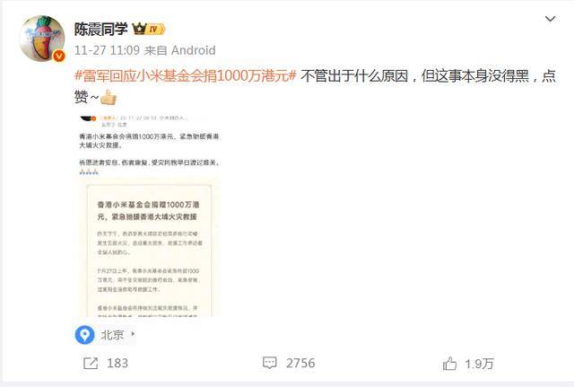 近日,擁有超過2400萬粉絲的知名汽車博主陳震因涉某電動汽車品牌相關(guān)言論引發(fā)網(wǎng)絡(luò)熱議,其多個社交平臺賬號隨后被禁言。事件起因于11月27日香港小米基金會宣布捐贈1000萬港元馳援香港大埔火災(zāi)救援,陳震在帶話題發(fā)布微博時稱“不管出于什么原因,但這事本身沒得黑,點(diǎn)贊”,該表述被部分網(wǎng)友質(zhì)疑“陰陽怪氣”,另有博主公開批評其“蹭熱度”。