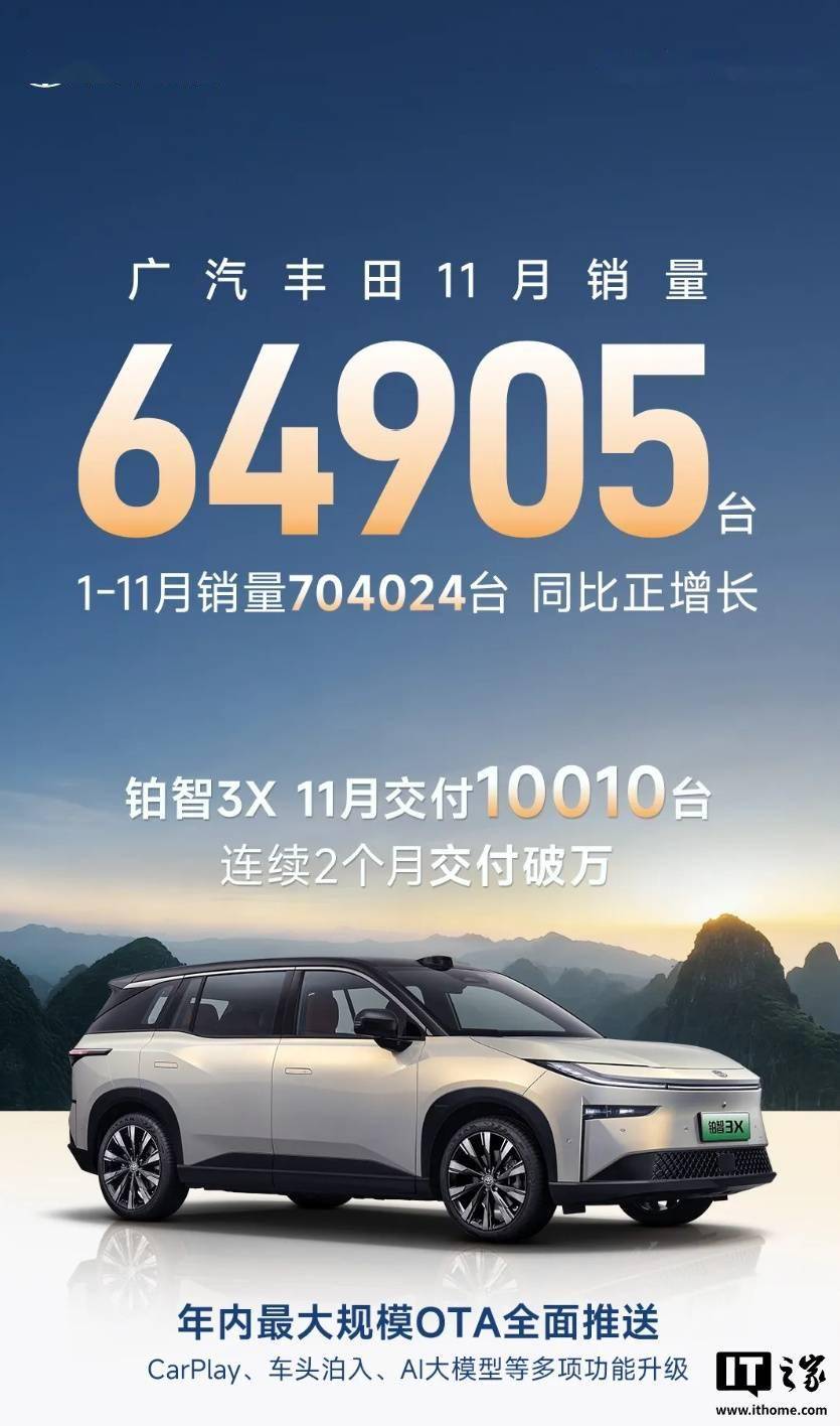 在新能源領(lǐng)域,廣汽豐田的鉑智3X純電緊湊型SUV表現(xiàn)亮眼。該車型在11月交付量突破1萬臺,連續(xù)兩個月保持這一佳績。與此同時,鉑智3X年內(nèi)最大規(guī)模的OTA升級已全面推送,用戶可體驗到CarPlay功能、車頭泊入技術(shù)以及AI大模型等新增功能,進(jìn)一步提升了駕駛體驗的智能化水平。