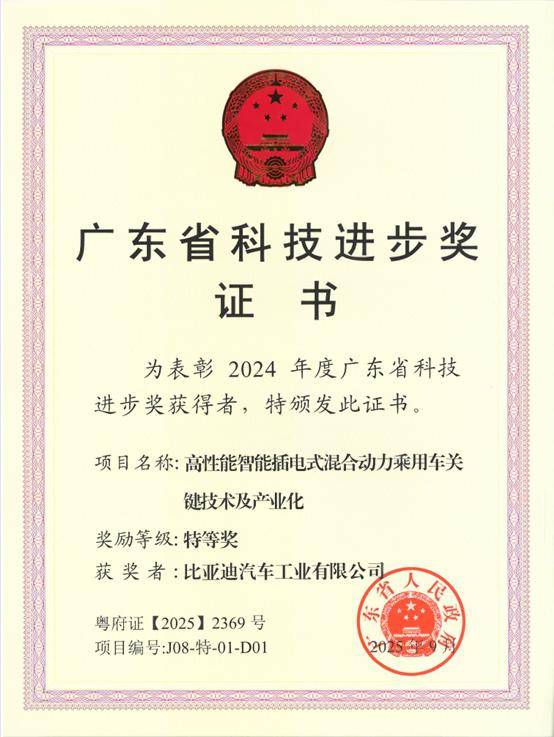 在最新公布的2024年度廣東省科學技術獎名單中,比亞迪憑借“高性能智能插電式混合動力乘用車關鍵技術及產業化”項目斬獲科技進步獎特等獎。這一殊榮標志著該企業在插電式混合動力技術領域的創新實力再次獲得權威認可,也是其近四年內第二次登頂該獎項。