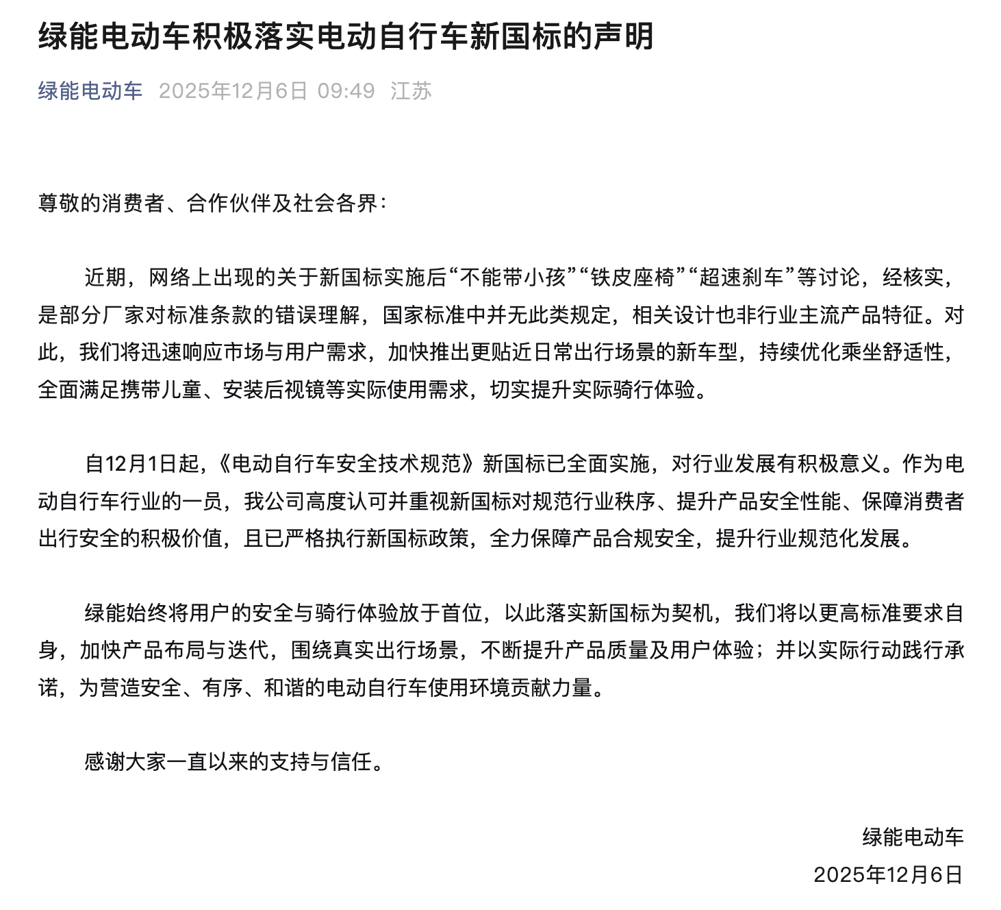 近日,綠能電動(dòng)車針對(duì)近期網(wǎng)絡(luò)熱議的新國(guó)標(biāo)相關(guān)話題作出正式回應(yīng)。部分網(wǎng)絡(luò)傳言稱,新國(guó)標(biāo)實(shí)施后電動(dòng)車將面臨“無(wú)法搭載兒童”“座椅材質(zhì)受限”“超速剎車性能下降”等限制,引發(fā)消費(fèi)者廣泛關(guān)注。經(jīng)企業(yè)核查,這些說(shuō)法均源于個(gè)別廠商對(duì)標(biāo)準(zhǔn)條款的誤讀,現(xiàn)行國(guó)家標(biāo)準(zhǔn)中并未包含此類規(guī)定,相關(guān)設(shè)計(jì)也并非行業(yè)主流產(chǎn)品特征。