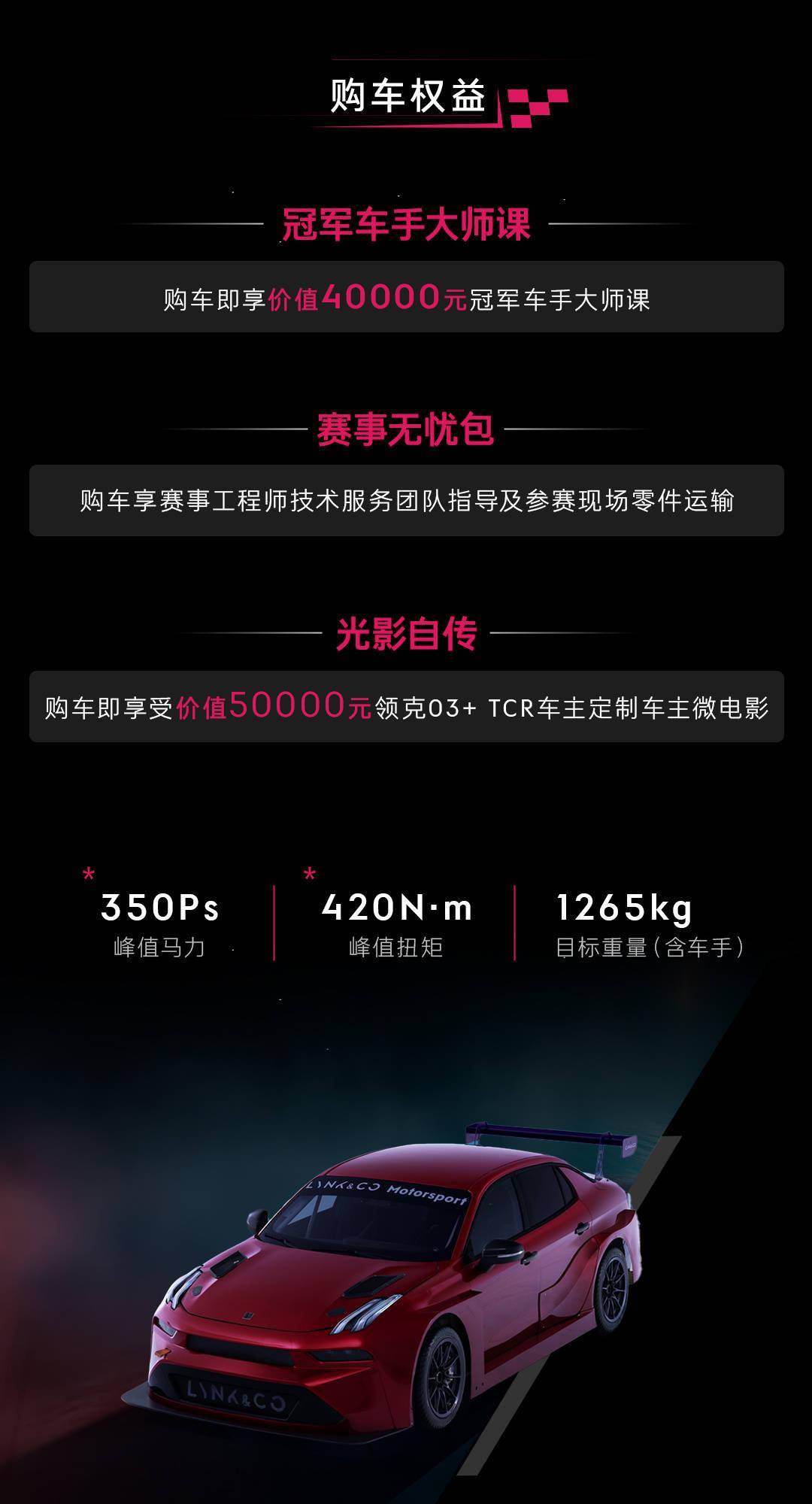 購買這款車的消費者將享有一系列專屬購車權益。其中包括價值 4 萬元的冠軍車手大師課,能讓車主近距離感受專業車手的駕駛技巧與經驗;賽車工程師技術服務團隊指導及參賽現場零件運輸服務,為車主在參與賽事時提供全方位的技術支持與后勤保障;還有價值 5 萬元的領克 03+ TCR 車主定制微電影,為車主留下獨特的專屬回憶。