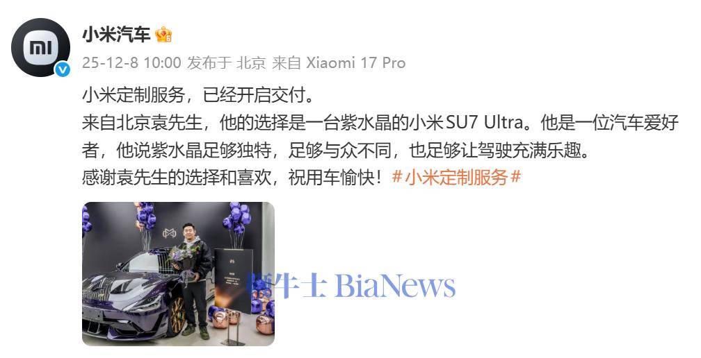 小米汽車近日正式啟動了其定制服務的交付工作,為消費者帶來了更多個性化選擇。其中,一位來自北京的汽車愛好者袁先生,成為了首批體驗者之一,他選擇了一臺紫水晶配色的小米SU7 Ultra,引發了廣泛關注。