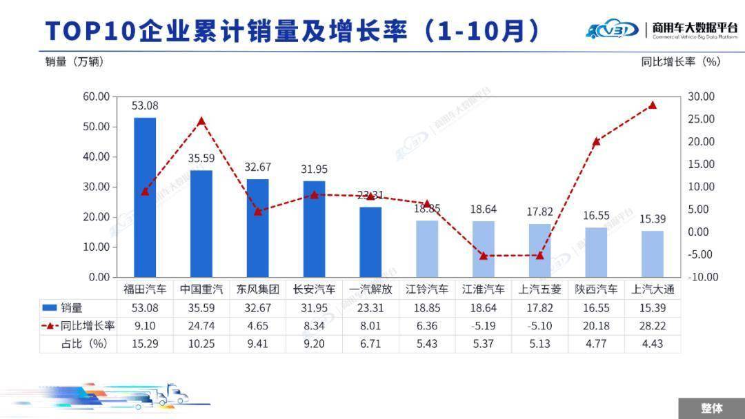 商用車市場的競爭格局正呈現出頭部企業集中與差異化競爭并存的特點。2025年1月至10月期間,市場前五名的商用車廠商合計占據超過五成的市場份額。這一現象反映出,在技術升級和市場競爭加劇的背景下,企業的規模效應和綜合實力對其發展至關重要。具體來看,銷量前五名的企業依次為福田汽車、中國重汽、東風集團、長安汽車和一汽解放。這些企業憑借完整的產品線、完善的銷售服務網絡以及持續的技術創新,在市場中確立了穩固的領導地位。其中,福田汽車以53.08萬輛的累計銷量位居榜首,同比增長9.10%,表現略優于行業平均水平。其成功得益于全系列商用車布局和新能源轉型的前瞻性戰略,特別是在輕卡和新能源物流車領域的優勢地位。目前,福田汽車已連續多年位居中國商用車行業銷量榜首,產品和服務覆蓋全球130多個國家和地區。